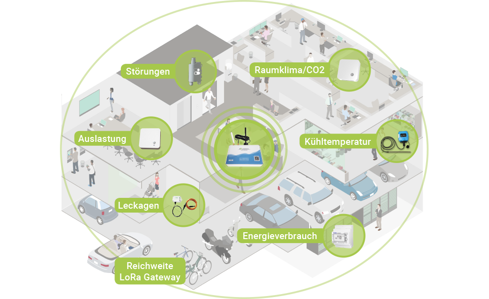 Ein Funkgateway reicht oft für das ganze Gebäude. Der Datenversand zur Cloud erfolgt per Mobilfunk. Kabel, IT und Netzwerk sind nicht notwendig.
