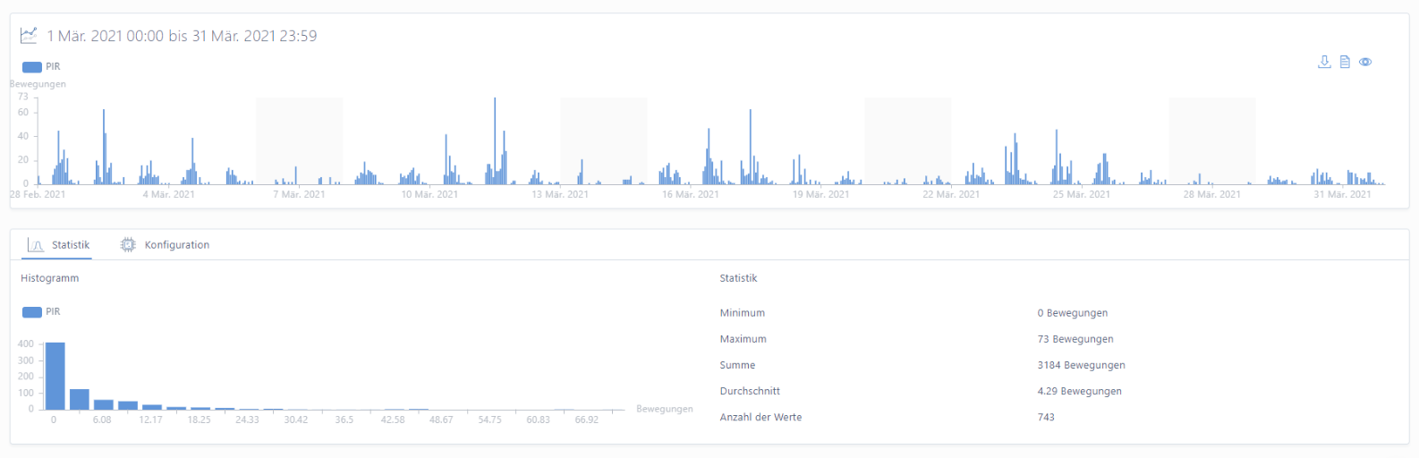 Der Sensor erfasst mittels PIR Sensor Bewegungen im Umkreis von max 5 Metern. Alle 5 Minuten wird die Anzahl der Bewegungen gesendet.